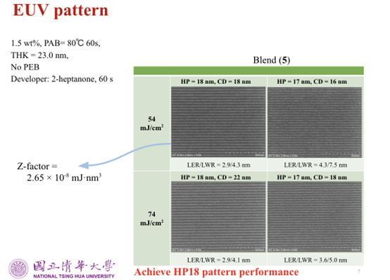 負責領導材料研發的國立清華大學化學系教授劉瑞雄指出,本次計畫促成一座先進光阻材料合成實驗室的成立,實驗室以金屬氧化物為核心,研發各種 EUV 負光阻材料,並與瑞士 PSI 中心合作進行 EUV 曝光測試,經過反覆實驗後,目前團隊所研發出來的 EUV 光阻材料已經可以將線邊緣粗糙度(LER)控制在 2nm 以下,甚至達到 1.6nm 的水準,優於一般標準的 3nm。且使用電子束(E-beam)模擬EUV曝光進行光刻測試,可以將線寬縮小到 15nm,未來目標將挑戰 10nm 以內。