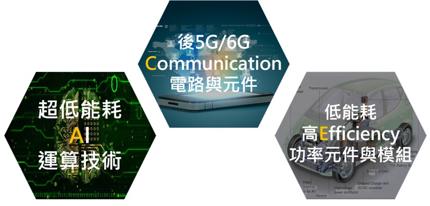 本五年整合型計畫針對未來(2025-2035)永續社會發展與經濟成長的需求,和業界未來商機與相關技術之瓶頸,開發並驗證所需的關鍵、前瞻、並具突破性的半導體元件和相關基本設計技術與智財,同時培育國內半導體相關產業所需的高階技術和工程人才;而相關的技術成果和產業貢獻目標則預定為在計畫結束後數年間(2028-2030)即可引入商業化和開始量產。本計畫與聯發科、台積電等世界級企業合組大聯盟,共同決定聚焦鼎極節能半導體技術,從系統觀點定義規格,開發下世代、無所不在、和節能省電的超大數據AI 技術 (主軸A), 超高速6G/B5G Communication技術 (主軸C),和超高效率電能/Energy轉換技術 (主軸E);這三大主軸/分項合起來簡稱“ACE”。