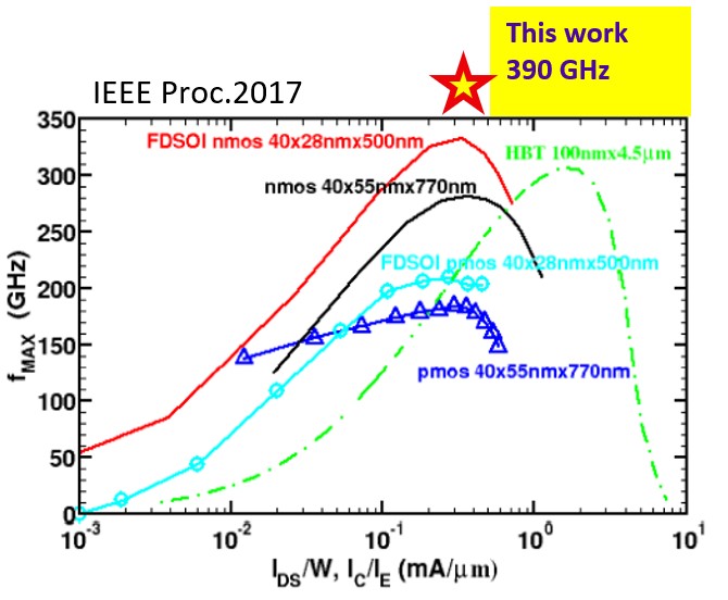 分項二(主軸C)發展下世代(B5G/6G)矽基與氮化鎵高速低延遲行動通訊元件(250-300GHz以上最大振盪頻率)與次太赫茲(100-300GHz)頻段新穎電路設計技術(PA,具開放架構與AI輔助之高頻6G收發器前端器件/Transceiver FE blocks,內嵌式天線)。計畫執行至今主要成果為次40奈米元件優化設計可極小化高頻等效閘極電阻與源極寄生電阻,大幅提升fMAX 25~56%,peakfMAX高達390 GHz,超越傳統元件如FDSOI與SiGe HBT(如下圖)。