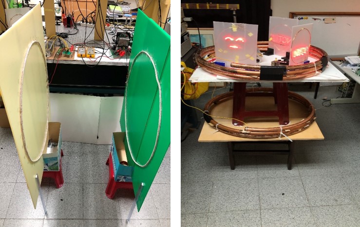 而分項三(主軸E)發展高效、高速、和低能耗之寬能隙(氮化鎵,氧化鎵)高壓電能轉換/功率元件與高效率智慧閘驅動快充轉換器、MIMO無線快充器電路等設計。研究成果亮點為: 1.成功開發InAlGaN/GaN on Si高功率元件,為全球首例、且特性優異。2. 運用本計畫開發的氮化鎵功率元件示範無線功率傳輸(如下圖),可傳達將近100瓦至1公尺遠的距離,呈現極大商用潛力。