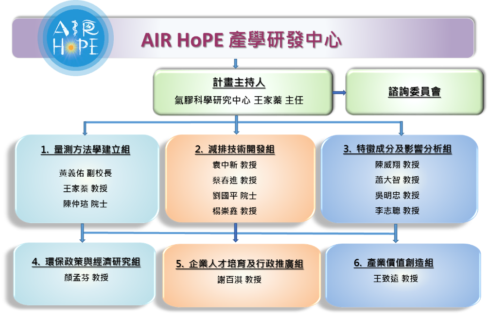 空氣污染及懸浮其中的PM2.5為影響當前全球生態環境及人類健康最嚴重的環境因子。高雄地區長期為重工業環繞,使工業排放成為高雄地區PM2.5的主要固定污染源。克服當前技術瓶頸來防制PM2.5的生成或排放,對降低高雄地區之PM2.5乃當務之急。本「AIR HoPE 產學研發中心」(以下簡稱AIR HoPE)秉持「業界出題,學界解題」精神,由國立中山大學氣膠科學研究中心與中鋼公司合作執行,由中鋼公司根據實際場域所面臨待解決之議題,擬定三大關鍵研發主軸,包括: (一) 建立量測方法學、(二)開發新穎污染減量技術,以及(三)根據各製程特徵成分開發新穎過濾技術及高效能PM濾材。本計畫同時規劃環保與經濟法規研究、企業人才培育以及新產業價值創造之任務編組,期能培育企業潛力人才並將各項新發展之技術及材料延伸至其他有空污減排需求之產業,創造新產業價值。AIR HoPE 之組織架構請詳圖一。